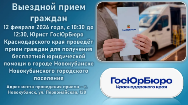 libnovokub@mail.ruЮрист ГосЮрБюро Краснодарского края проведёт прием граждан для получения бесплатной юридической помощи.